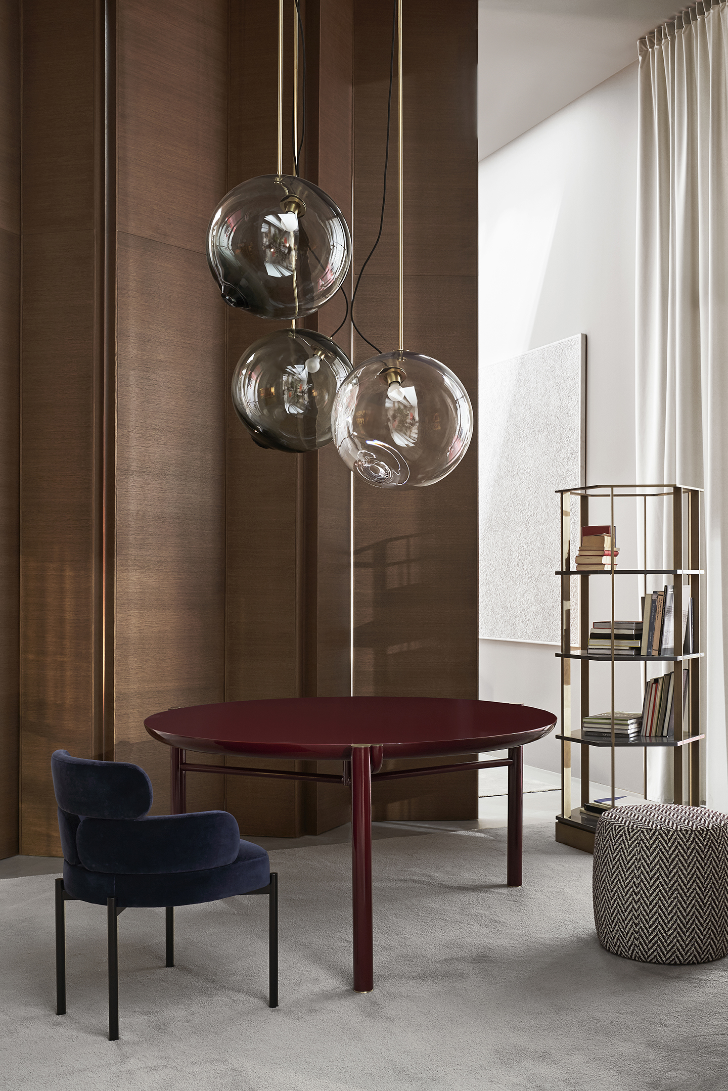 Large spheres of handblown Czech glass suspended on rigid brass stems. Two glass sizes available. A custom brass socket assembly through one side holds the light bulb and is connected to the canopy at the ceiling with a length of exposed fabric-wrapped electrical cord. Each glass sphere is blown by hand without the use of moulds, and so is slightly imperfect in shape. Two brass thumb screws attach the removable bulb-and-socket from the side of the glass.