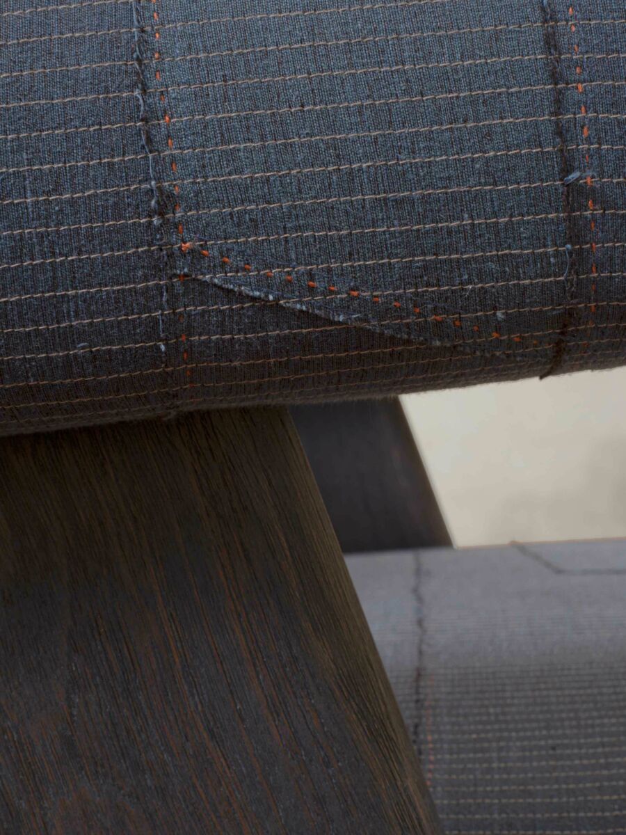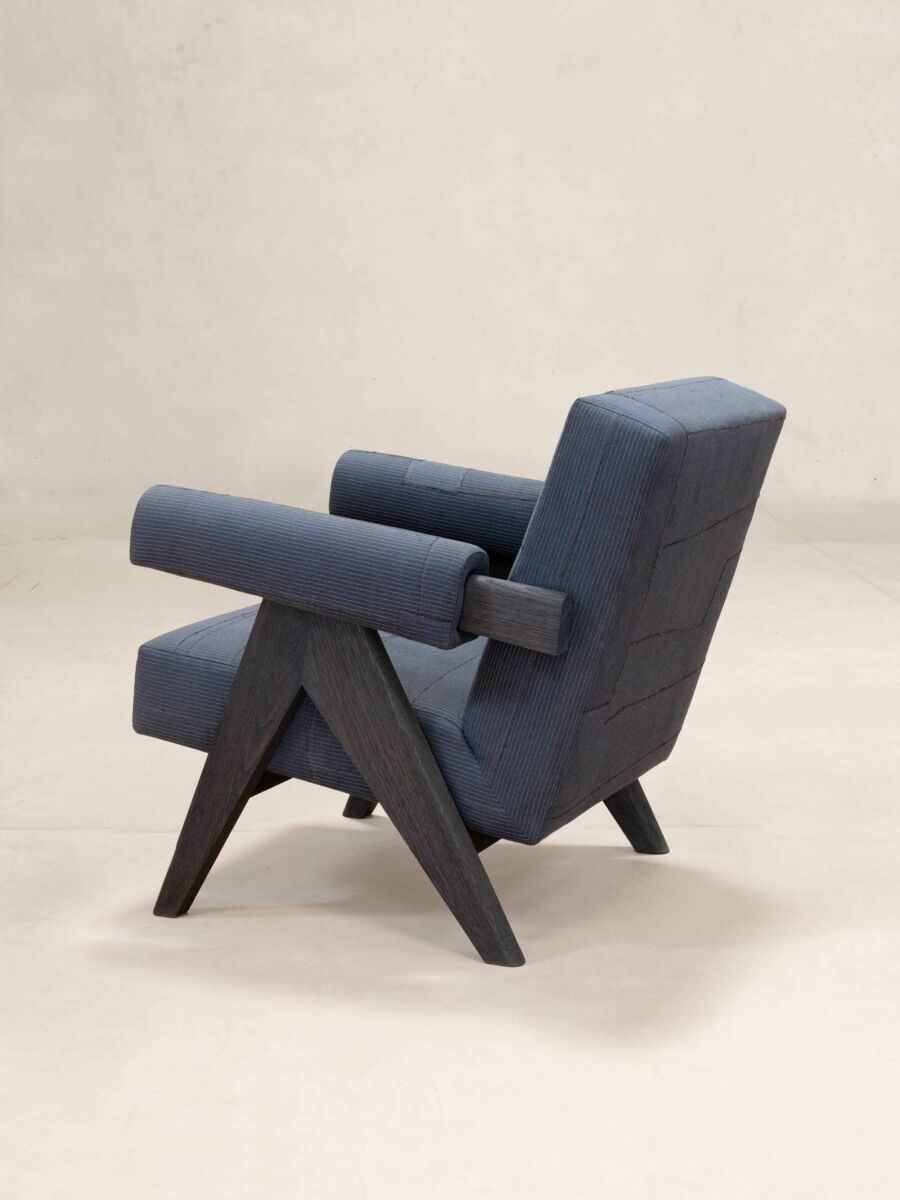 A re-edition of the Easy Armchair, a comfortable lounge chair with signature compass legs, originally designed for offices and residences in Chandigarh and Ahmedabad. Products in the KeSa Upholstery Collection are available in a set of fabric colourways, designed and produced by textile designer Padmaja Krishnan. The Upholstered Easy Armchair / KeSa Sand is available in the Sand patchwork fabric in 100% certified organic cotton and the Mocha-Driftwood wood finish.